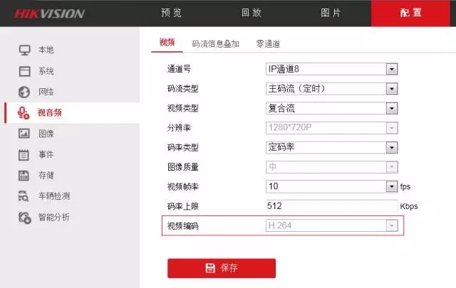 假如早已是H.264编号,還是出错,请将监控摄像头从录像机上删掉,网页访问监控摄像头,点一下配备—高級配备—音频视频,将视频解码文件格式转换成H.264,再到录像机里再次加上。